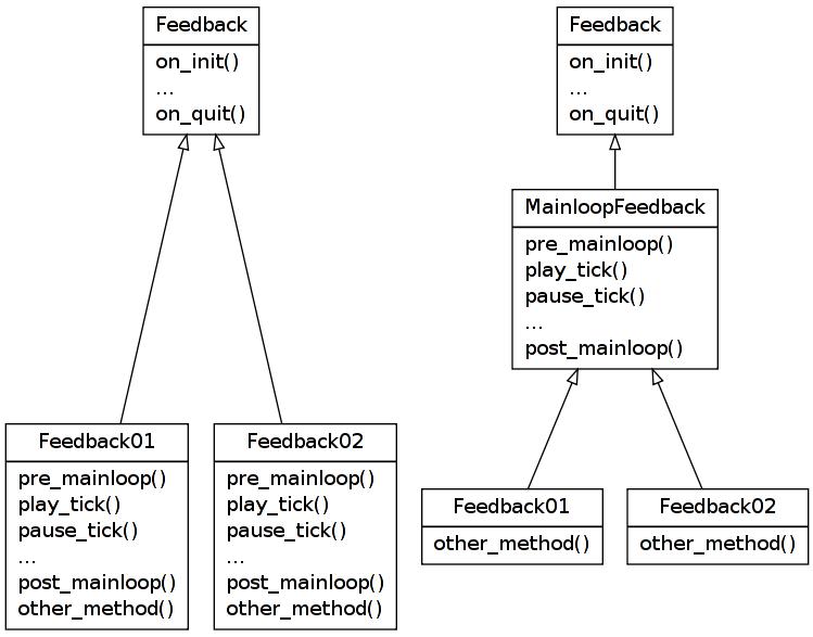 The above figure shows an example: on the left side two similar Feedbacks share a fair amount of code. Both Feedbacks work with a main loop. They have a set of main loop related methods and other more Feedback specific related methods. Implementing a third Feedback with a main loop means probably that the programmer will copy the main loop related part from one of the existing Feedbacks into his new Feedback. This a bad thing for several reasons, the most important one being that a bug in the main loop related logic will probably appear in all Feedbacks and thus has to be fixed in every single Feedback using this logic. The solution is to extract the main loop related logic into a base class and implement it there. The Feedbacks can derive from this class, inherit the logic and only need to implement the Feedback specific part. The code of the Feedbacks is much shorter, less error prone and main loop related bugs can be fixed in a single file.