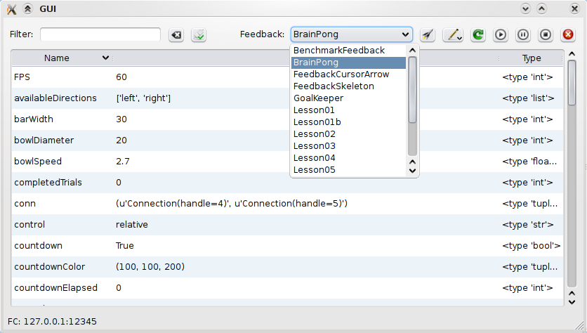 The framework provides a graphical user interface (GUI) which enables easy access to the Feedback Controller's main functions and the Feedback's variables. The GUI communicates with the Feedback Controller like the system connected to Pyff does: via XML over UDP. Therefore, the GUI does not have to run on the same machine as the Feedback Controller does, which is particularly useful for experiments where the experimenter and subject are in different rooms.