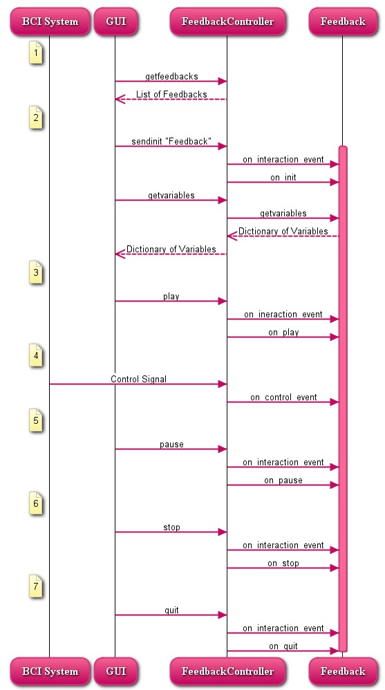 The table above shows the complete list of available commands in Control signals and the figure below shows a sequence diagram illustrating the interaction between the GUI, the Feedback Controller and the Feedback. All signals coming from the GUI are Interaction Signals, the signals coming from the BCI system are Control Singals. Once the GUI was started, it tries automatically to connect to a running Feedback Controller on the machine where the GUI is running. If that failed (e.g., since the Feedback Controller runs on a different machine on the network) the experimenter can connect it manually by providing the host name or IP address of the target machine. Upon a successful connection with the Feedback Controller, the Feedback Controller replies with a list of available Feedbacks which is then shown in the GUI in a drop down menu for available Feedbacks. The experimenter can now select a Feedback in the GUI and click the Init Button, on which the GUI will send the appropriate signal to the Feedback Controller telling it to load the desired Feedback. The Feedback Controller loads the Feedback and requests the Feedback's object variables which it sends back to the GUI. The GUI then shows them in a table, where the experimenter can inspect and manipulate them. Within the GUI the experimenter can also Start, Pause, Stop and Quit the Feedback.